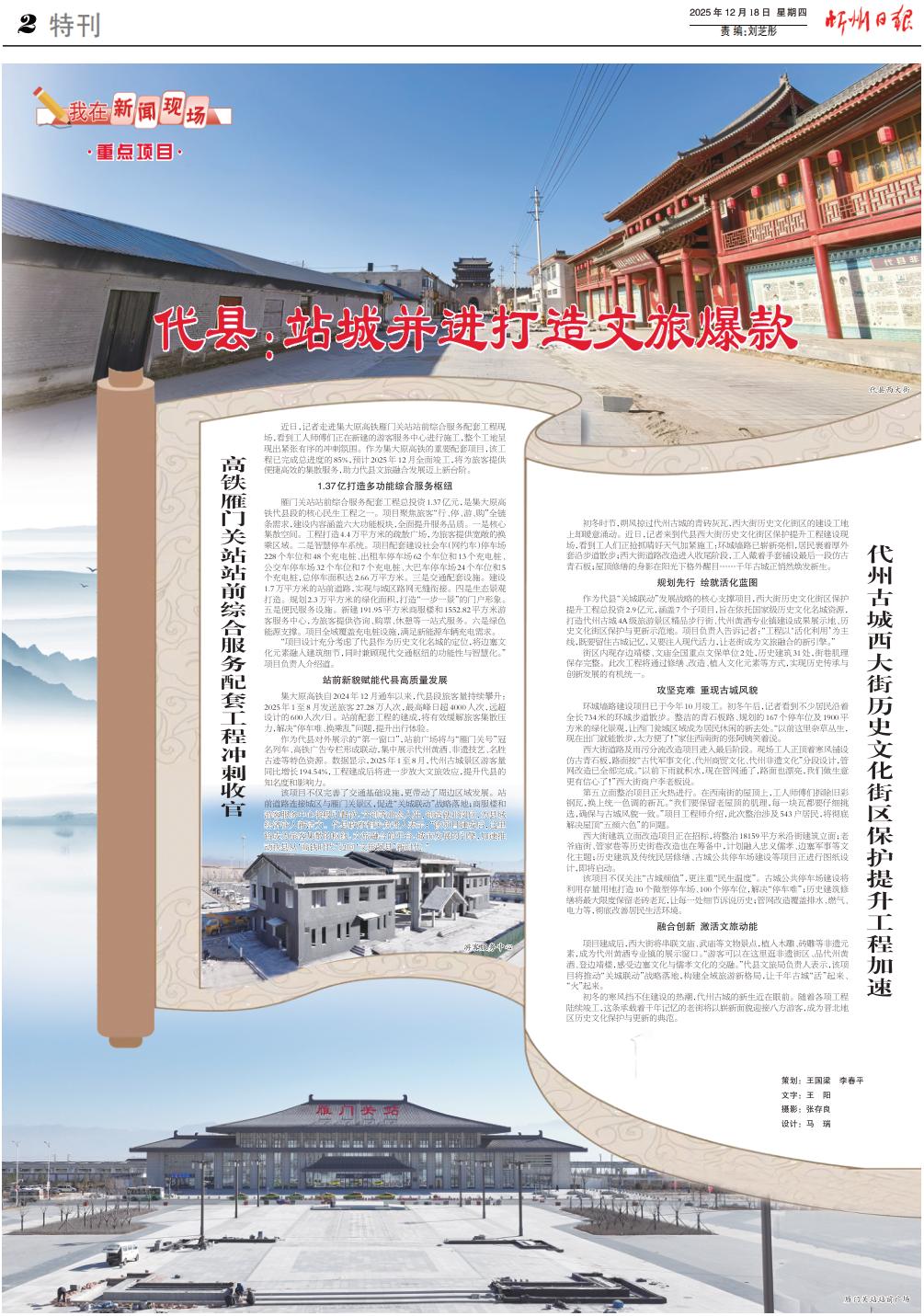作為代縣對外展示的“第一窗口”,站前廣場將與“雁門關(guān)號”冠名列車、高鐵廣告專欄形成聯(lián)動,集中展示代州黃酒、非遺技藝、名勝古跡等特色資源。數(shù)據(jù)顯示,2025年1至8月,代州古城景區(qū)游客量同比增長194.54%,工程建成后將進(jìn)一步放大文旅效應(yīng),提升代縣的知名度和影響力。