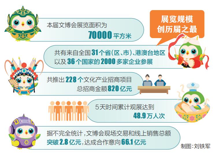本屆文博會(huì)展覽面積為7萬(wàn)平方米,共有來(lái)自全國(guó)31個(gè)?。▍^(qū)、市)、港澳臺(tái)地區(qū)以及36個(gè)國(guó)家的2000多家企業(yè)參展,展覽規(guī)模創(chuàng)歷屆之最。共推出228個(gè)文化產(chǎn)業(yè)招商項(xiàng)目,總招商金額820億元,5天時(shí)間累計(jì)觀展達(dá)到48.9萬(wàn)人次。據(jù)不完全統(tǒng)計(jì),文博會(huì)現(xiàn)場(chǎng)交易和線上銷售總額突破2.8億元,達(dá)成合作意向66.1億元。通過(guò)打造集視覺(jué)、聽(tīng)覺(jué)、互動(dòng)體驗(yàn)與交易功能于一體的文化展示空間,舉辦“山西文化地標(biāo)”“山西文化科技融合發(fā)展”“山西省文化傳承發(fā)展”典型案例發(fā)布活動(dòng),全方位、立體式展現(xiàn)了三晉文化的獨(dú)特魅力,為推動(dòng)全省文化繁榮和經(jīng)濟(jì)社會(huì)高質(zhì)量發(fā)展注入了強(qiáng)勁動(dòng)力。
