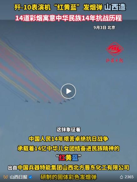 閱兵式上,10時25分左右,殲-10表演機從天空呼嘯而過,留下14條絢麗奪目的彩煙——這抹象征著中國人民14年艱苦卓絕抗日戰(zhàn)爭、承載著14億中華兒女團結(jié)奮進(jìn)民族精神的“紅黃藍(lán)”,出自中國兵器特能集團山西北方晉東化工有限公司(以下簡稱“晉東公司”)研制的固體彩色發(fā)煙彈。