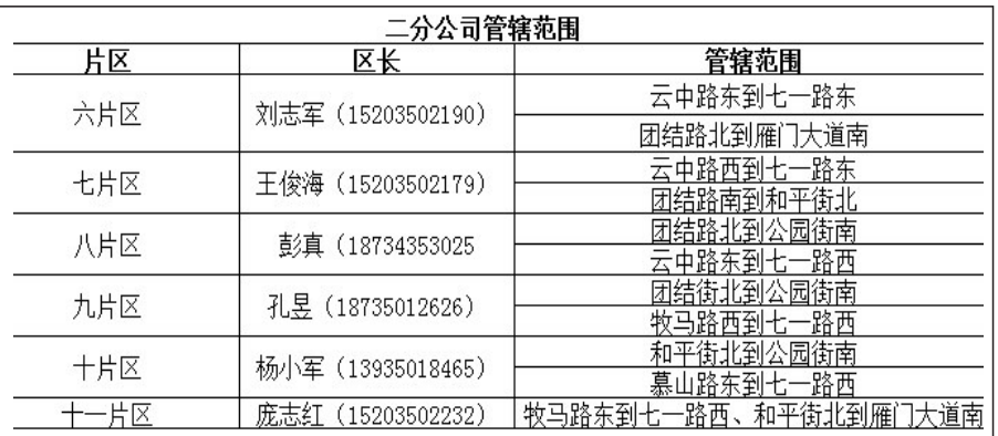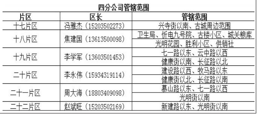 近期,忻州熱力有限公司收到很多用戶上門反饋,普遍反映客服熱線占線時間太長,無法及時反映供熱情況,導(dǎo)致用戶遇到供熱相關(guān)問題或故障無法及時反饋。根據(jù)群眾目前遇到的困難,忻州熱力有限公司公布了22個供熱片區(qū)及負(fù)責(zé)人聯(lián)系方式,以便用戶及時反饋。