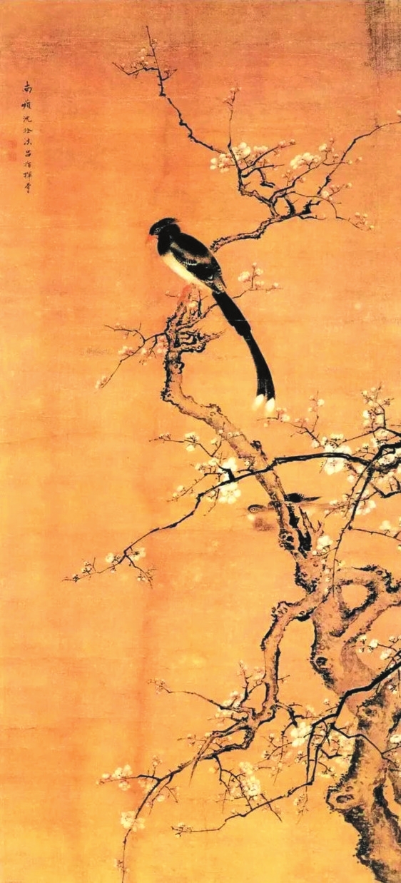 宋代畫家筆下的梅花大都與禽鳥有所關(guān)聯(lián),這主要得益于花鳥畫在此時的繁盛之勢。宋徽宗趙佶的《臘梅山禽圖》就把梅花與白頭翁聯(lián)系起來,描繪了在乍暖還寒的季節(jié)里,兩只相伴而生的白頭翁立于臘梅枝頭的場景,給觀者帶來復(fù)蘇之感。作品左下角題詩“山禽矜逸態(tài),梅粉弄輕柔。已有丹青約,千秋指白頭”,表達了愛情之思。因為白頭翁在傳統(tǒng)文化中象征吉祥與幸福,是對白頭偕老的隱喻,當它與梅花結(jié)合起來時,便會強化人們對美好愛情的聯(lián)想。