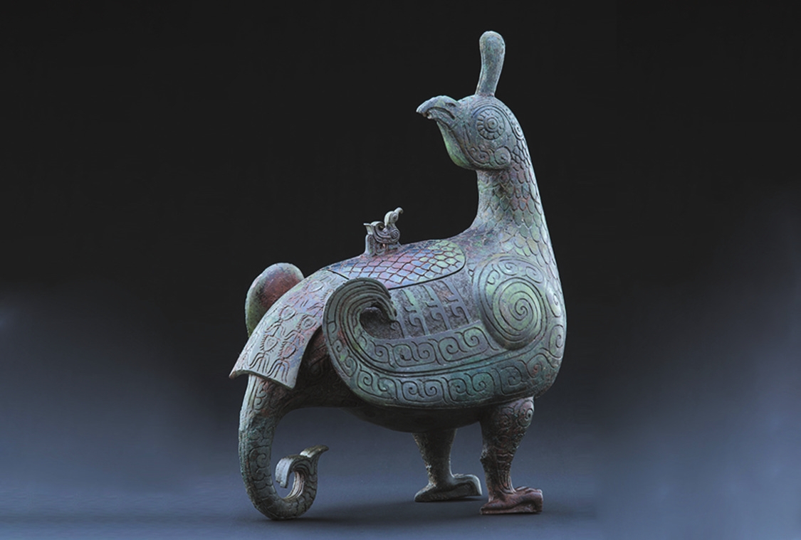 山西,東倚巍峨太行,西臨滔滔黃河,表里山河。作為中華民族的重要發(fā)祥地之一,這里地上地下的古代遺珍燦若星辰。晉侯鳥(niǎo)尊,高39厘米,長(zhǎng)30.5厘米,寬17.5厘米。整個(gè)器物以佇立回首的鳳鳥(niǎo)為主體造型,鳥(niǎo)頭微昂,圓睛凝視,高冠直立,體軀豐滿(mǎn),兩翼上卷。鳥(niǎo)背依形設(shè)蓋,蓋鈕為小鳥(niǎo)形,與鳳鳥(niǎo)對(duì)望,雙腿粗壯,爪尖略蜷。全身布滿(mǎn)了精美紋飾,頸、腹、背裝飾羽片紋,兩翼與雙腿裝飾云紋,翼、蓋間裝飾立羽紋,以雷紋襯底,尾部裝飾華麗的羽翎紋。