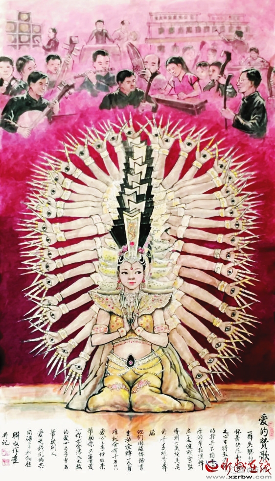 觀音震撼人生美,纖手飄飄繪彩虹。