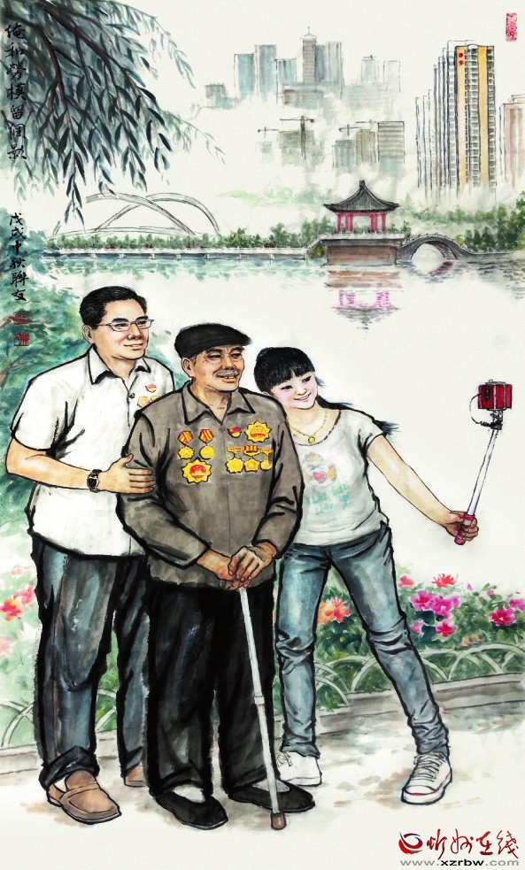 我與功勛留個(gè)影,榮光虎勁駐心湖。