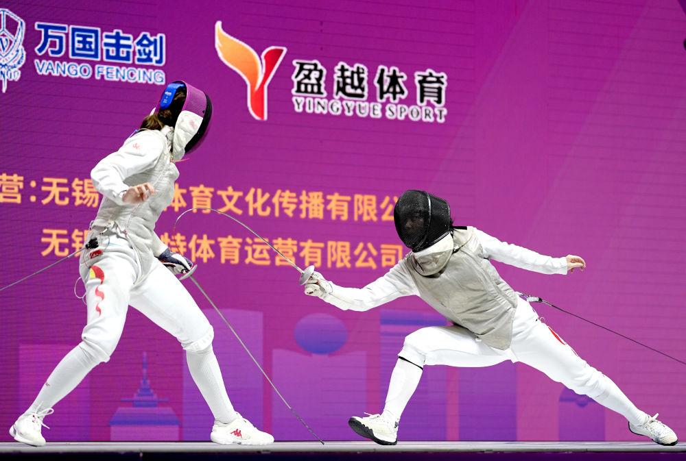 傅瑩瑩(右)與宋玥在女子花劍團(tuán)體賽決賽中
