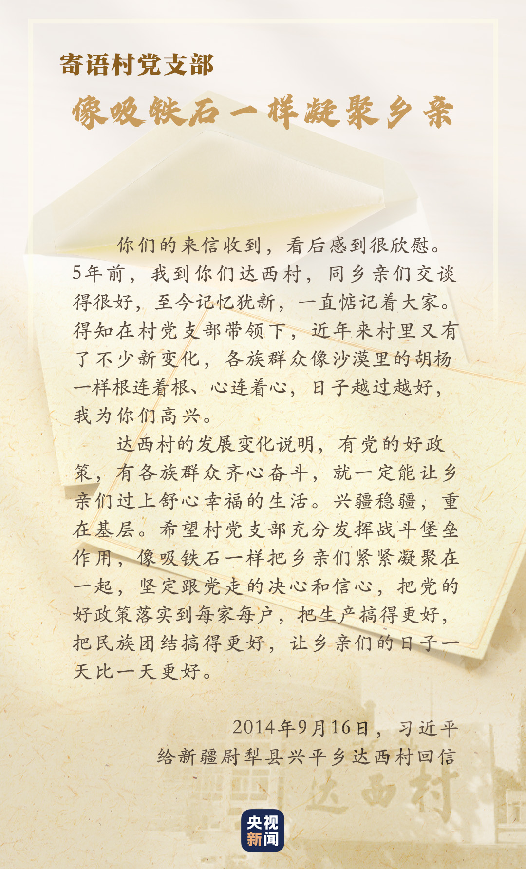 “口袋里要鼓囊囊,精神上要亮堂堂”。2014年4月,習(xí)近平在新疆考察時(shí)講到了達(dá)西村的村訓(xùn)。村民們懷著激動(dòng)的心情給總書(shū)記寫(xiě)信,匯報(bào)這些年村里的積極變化。當(dāng)年9月,習(xí)近平總書(shū)記給沙吾爾·芒力克和全體村民回信,強(qiáng)調(diào)興疆穩(wěn)疆,重在基層。