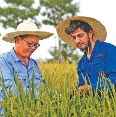 在巴基斯坦東部旁遮普省首府拉合爾西南郊,中國農(nóng)業(yè)專家(左)與育種站助理研究員瓦西姆·瓦希德在稻田里進(jìn)行雜交水稻選種試驗(yàn)。新華社記者 蔣 超攝