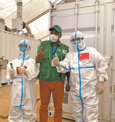 2020年9月2日,在幾內(nèi)亞首都科納克里的一個核酸檢測取樣點(diǎn),中國抗疫醫(yī)療專家組成員與當(dāng)?shù)毓ぷ魅藛T合影。新華社發(fā)