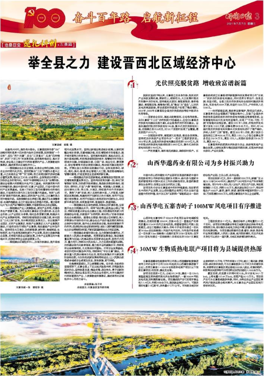 ——經(jīng)濟(jì)綜合實力顯著增強(qiáng)。昔日的五寨是一個老山區(qū)、窮地方。通過100年的努力,五寨經(jīng)濟(jì)總量快速增長,綜合實力大幅提升。特別是黨的十八大以來,五寨縣立足風(fēng)、光、農(nóng)業(yè)等優(yōu)勢,壯大核心企業(yè),延長產(chǎn)業(yè)鏈條,推動經(jīng)濟(jì)綜合實力顯著提升??傃b機(jī)容量78.6兆瓦的光伏電站、1×30兆瓦生物質(zhì)熱電聯(lián)產(chǎn)、總規(guī)模400兆瓦的風(fēng)力發(fā)電、晉西北天然氣、昌茂石油、金航運輸?shù)纫慌卮螽a(chǎn)業(yè)項目建成投產(chǎn);五寨現(xiàn)代農(nóng)業(yè)產(chǎn)業(yè)園區(qū)成功入選國家首批農(nóng)村產(chǎn)業(yè)融合發(fā)展示范園,示范帶動效應(yīng)日益顯現(xiàn);建成9座大型煤炭集運站,帶動發(fā)煤企業(yè)達(dá)90余戶,形成了具有地域特點的煤炭發(fā)運基地,既實現(xiàn)了煤炭產(chǎn)業(yè)“無中生有”,又有效帶動餐飲、住宿、汽修汽配、成品油經(jīng)營、餐飲服務(wù)等相關(guān)產(chǎn)業(yè)快速發(fā)展,使第三產(chǎn)業(yè)成為全縣經(jīng)濟(jì)的支柱產(chǎn)業(yè),推動縣域高質(zhì)量轉(zhuǎn)型發(fā)展邁出新步伐。2020年,全縣地區(qū)生產(chǎn)總值完成31.4億元,是1949年的786倍。