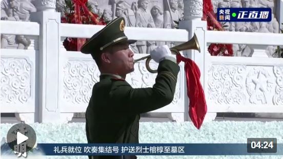 禮兵手捧、護(hù)送烈士棺槨至墓區(qū)