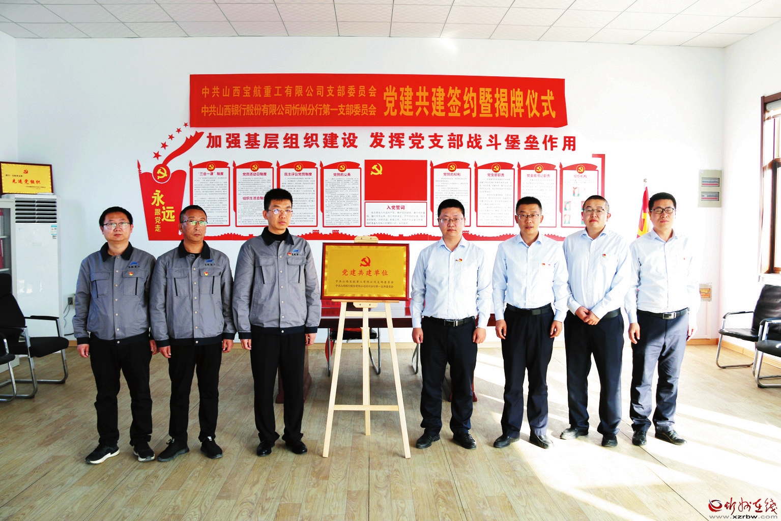 山西銀行忻州分行第一黨支部負責人、山西寶航重工有限公司負責人共同為“黨建共建單位”揭牌,共同簽署了黨建共建協(xié)議。