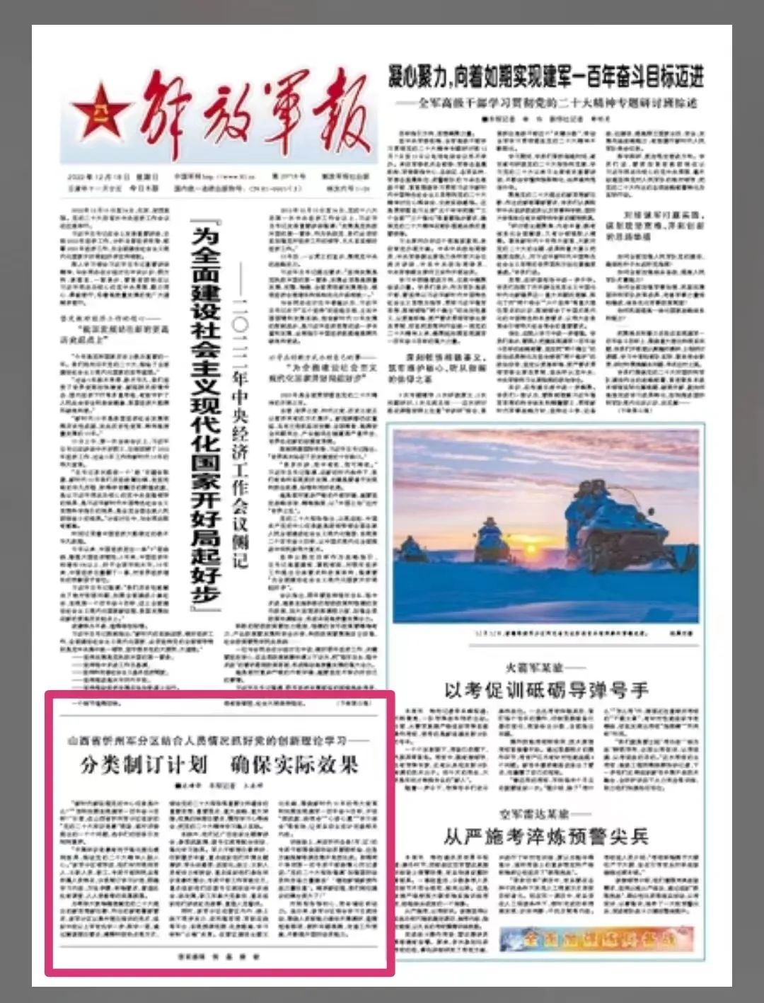 為幫助大家準確理解黨的二十大提出的新思想新論斷、作出的新部署新要求,該軍分區(qū)以集中理論培訓的形式,組織中校以上軍官先學一步、深學一層,通過解讀理論要點、闡釋時政熱點等方式,領會黨的二十大報告等重要文件蘊含的重要思想、重要觀點、重大戰(zhàn)略、重大舉措;收集歸納理論要點,撰寫學習心得體會,把黨的二十大精神學習融入實踐。