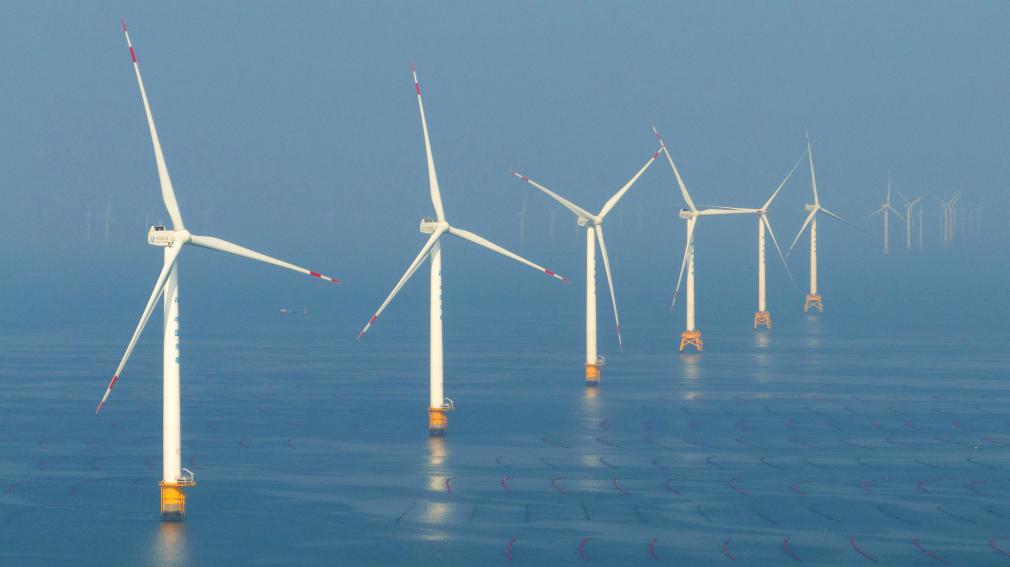 距離大連莊河市海岸線20多公里的黃海海域,300多座高約百米的“大風(fēng)車”聳立在藍天碧海間,巨大的風(fēng)電機組葉片不停轉(zhuǎn)動。莊河市發(fā)展和改革局副局長吳靜說:“目前,莊河已有4個海上風(fēng)電項目并網(wǎng)運行,年發(fā)電量可達27.3億度。”