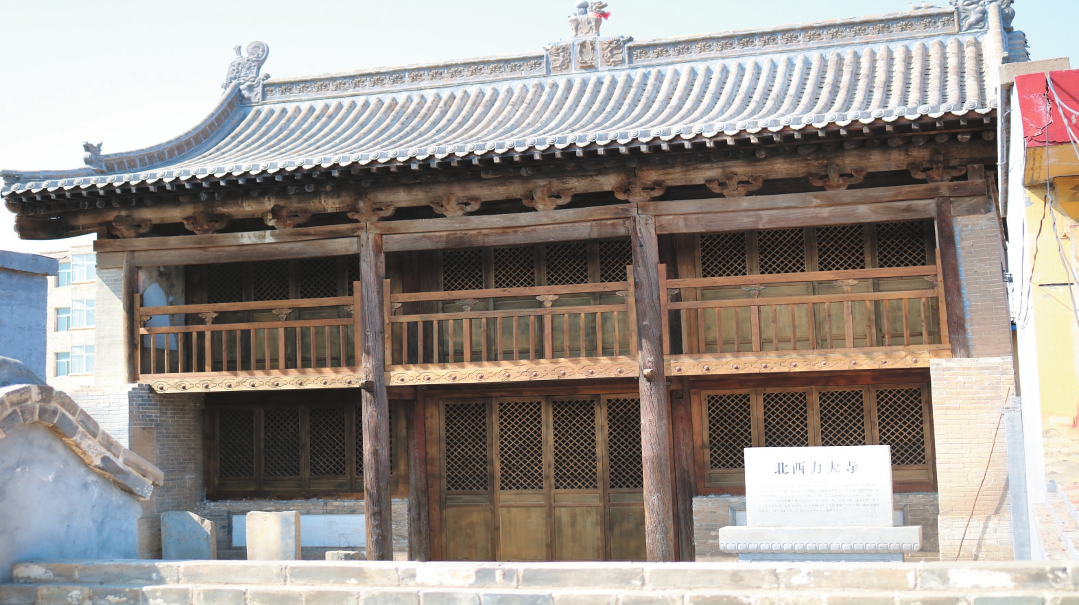北西力大寺位于定襄縣晉昌鎮(zhèn)北西力村中,坐北朝南,東西長(zhǎng)11.1米、南北寬8.4米,占地面積約93平方米。據(jù)梁架題記記載為明萬(wàn)歷四十三年(1615)所建。該寺沿中軸線原建有山門、過(guò)廳、正殿,兩側(cè)建有東西配房?,F(xiàn)僅存正殿,為二層樓閣式結(jié)構(gòu),面寬三間,進(jìn)深四椽,前設(shè)廊,單檐懸山頂,五檁架結(jié)構(gòu)。二層廊前兩側(cè)有人物壁畫約4平方米。2015年8月25日公布為市級(jí)文物保護(hù)單位。