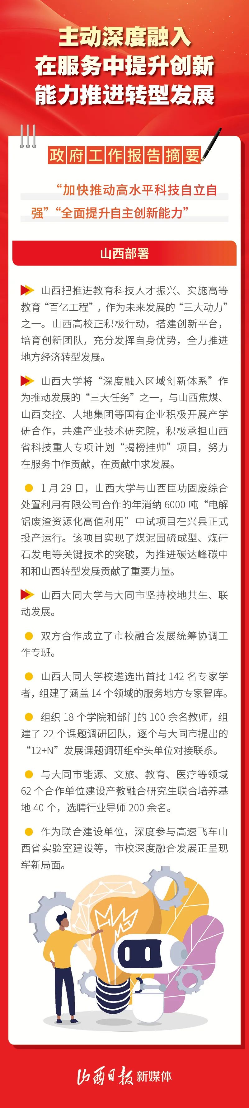 今年政府工作報告指出,堅持教育強國、科技強國、人才強國建設(shè)一體統(tǒng)籌推進,創(chuàng)新鏈產(chǎn)業(yè)鏈資金鏈人才鏈一體部署實施。這為山西高校更好地服務(wù)全省各地轉(zhuǎn)型發(fā)展、高質(zhì)量發(fā)展提供了遵循。