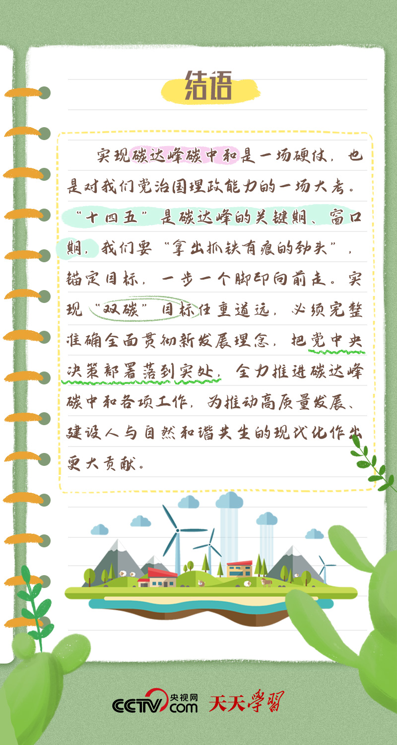 天天學(xué)習(xí)今年全國兩會,習(xí)近平總書記在政協(xié)聯(lián)組會上,對“雙碳”工作作出最新部署??倳洀娬{(diào):“全面準(zhǔn)確落實精準(zhǔn)治污、科學(xué)治污、依法治污方針,推動經(jīng)濟社會發(fā)展綠色化、低碳化,加強資源節(jié)約集約循環(huán)利用,拓展生態(tài)產(chǎn)品價值實現(xiàn)路徑,積極穩(wěn)妥推進碳達峰碳中和,為高質(zhì)量發(fā)展注入新動能、塑造新優(yōu)勢?!?/p>