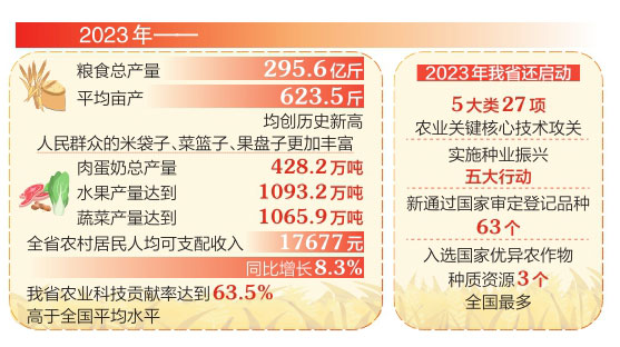 一分耕耘一分收獲。近年來,我省糧食和重要農(nóng)產(chǎn)品生產(chǎn)穩(wěn)定、供給充足,農(nóng)業(yè)農(nóng)村現(xiàn)代化不斷邁出新步伐。2023年,糧食總產(chǎn)量295.6億斤,平均畝產(chǎn)623.5斤,均創(chuàng)歷史新高;人民群眾的米袋子、菜籃子、果盤子更加豐富,肉蛋奶總產(chǎn)量428.2萬(wàn)噸,水果、蔬菜產(chǎn)量分別達(dá)到1093.2萬(wàn)噸、1065.9萬(wàn)噸;全省農(nóng)村居民人均可支配收入17677元,同比增長(zhǎng)8.3%。這些成績(jī)的取得,得益于科技賦能助力。2023年我省農(nóng)業(yè)科技貢獻(xiàn)率達(dá)到63.5%,高于全國(guó)平均水平。