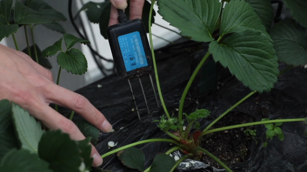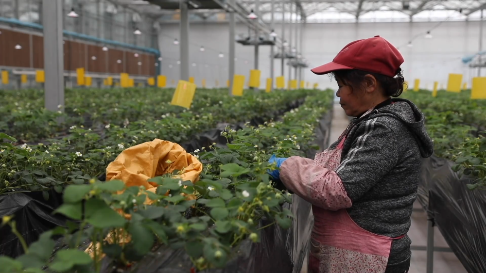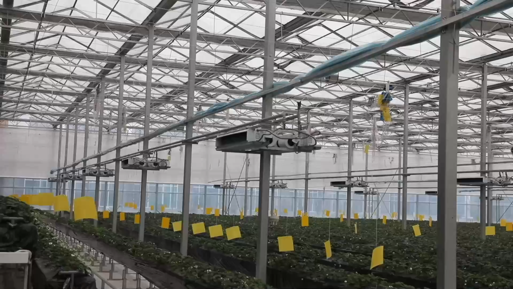 智慧農(nóng)場玻璃溫室現(xiàn)共種植三個品種、八萬株草莓,均為自主繁育的草莓苗??茖W種植促進了豐產(chǎn),兩座玻璃溫室均可實現(xiàn)一年四季連續(xù)生產(chǎn)。