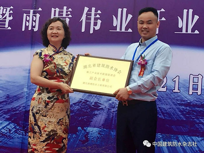 隨后,湖北防水協(xié)會(huì)會(huì)長(zhǎng)桂春芳女士代表湖北防水協(xié)會(huì)在開(kāi)業(yè)慶典大會(huì)上發(fā)表重要講話,她對(duì)湖北雨晴由最開(kāi)始的施工企業(yè)轉(zhuǎn)型為防水系統(tǒng)服務(wù)商的工程進(jìn)行了簡(jiǎn)要介紹,并對(duì)之前雨晴承接的眾多國(guó)家大型、重點(diǎn)項(xiàng)目的防水工程予以肯定,并對(duì)雨晴在湖北乃至華中地區(qū)較高知名度,美譽(yù)度,影響力予以了肯定。她還說(shuō):當(dāng)前,高質(zhì)量發(fā)展是新時(shí)代的要求,也是防水行業(yè)新時(shí)代的使命,并希望雨晴集團(tuán)在產(chǎn)品質(zhì)量、工程質(zhì)量和服務(wù)質(zhì)量的管理上進(jìn)一步做深做透做細(xì),日益精進(jìn)。心無(wú)旁騖造產(chǎn)品、一絲不茍干工程、全心全意做服務(wù),使雨晴集團(tuán)快速進(jìn)入高質(zhì)量高效益發(fā)展的康莊大道。之后授予雨晴公司“湖北省建筑防水協(xié)會(huì)施工產(chǎn)業(yè)技術(shù)聯(lián)盟促進(jìn)會(huì)副會(huì)長(zhǎng)單位”。